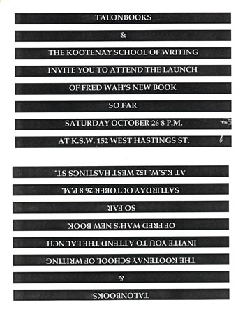 A reading to celebrate the launch of Wah's book So Far (Talonbooks 1991). Saturday, July 29/89
