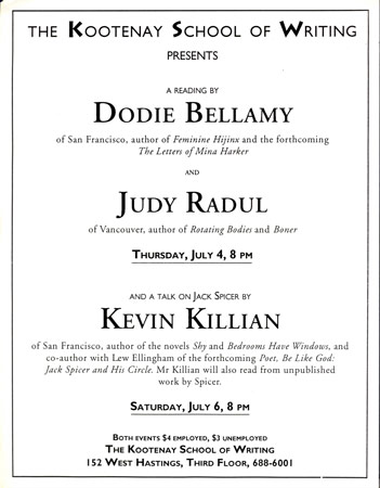 Dodie Bellamy read at: Kootenay School of Writing 1987 - 1995