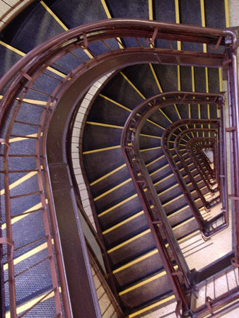 | Proprioception Books was for several years a crucial hub in the Vancouver poetry scene. Originally owned by Ralf Maud, it was sold to Lisa Robertson. Proprioception carried only books of poetry, theory and criticism. Its second home was in a room on the 7th floor of the Dominion Building. Pictured here is the stunning spiral staircase that runs down the building's centre.